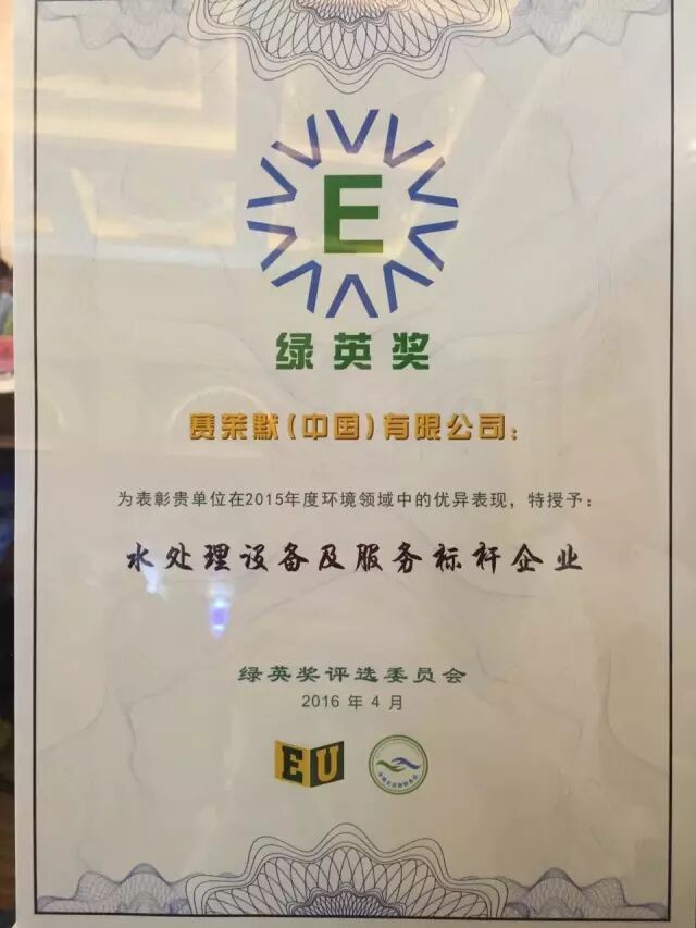 今日下午,在第九屆中國環(huán)境產(chǎn)業(yè)大會上,賽萊默榮獲2016“綠英獎“暨“水處理設(shè)備及服務(wù)標(biāo)桿企業(yè)”稱號。